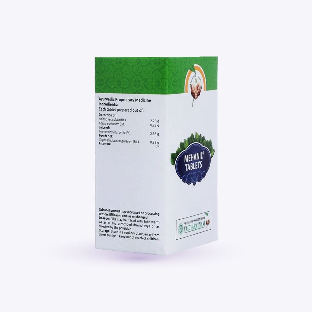 Why Choose Mehanil Tablets? Ayurvedic Heritage: Traditional Ayurvedic botanicals that support metabolic health. Holistic Wellness Support: Helps maintain balanced energy levels and supports natural sugar-management routines. Trusted Quality: Manufactured by Vaidyaratnam Oushadhasala ensuring authenticity and classical preparation.